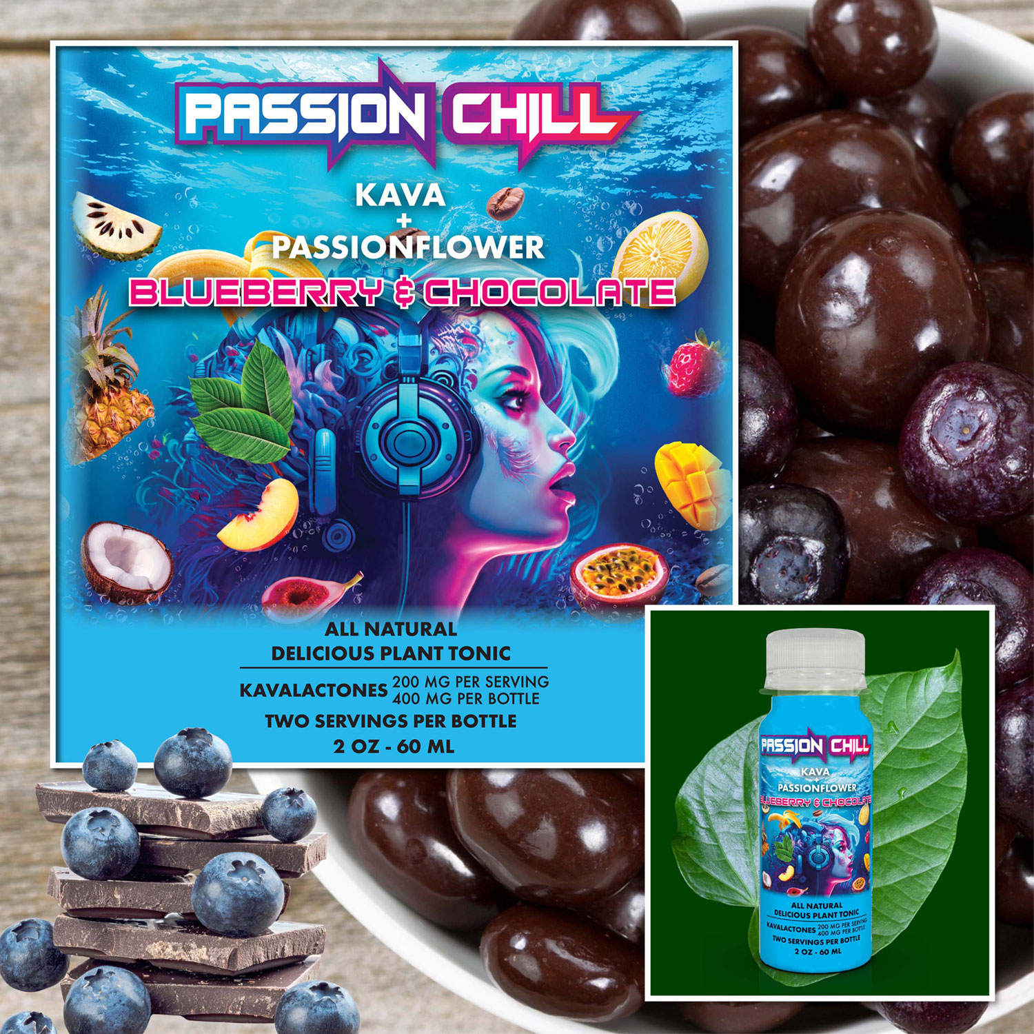 Passion Chill. 400 mg kavalactones. Blueberry & Chocolate Flavor